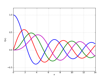 # Bessel function J_n(x) on the real line for n=0,1,2,3 j0 = lambda x: besselj(0,x) j1 = lambda x: besselj(1,x) j2 = lambda x: besselj(2,x) j3 = lambda x: besselj(3,x) plot([j0,j1,j2,j3],[0,14])