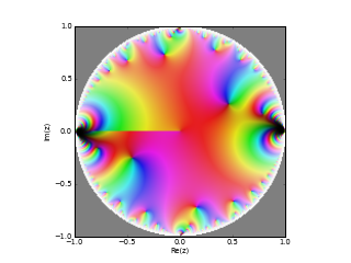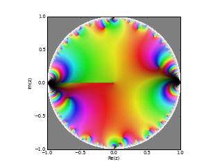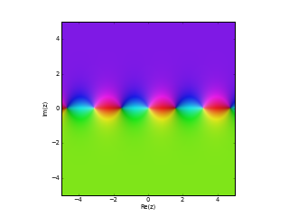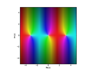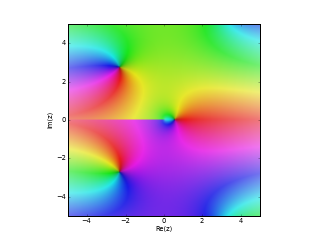 The complex plots show the magnitude as brightness (0 = black, ∞ = white) and the phase as hue (positive real = red, imaginary = lime, negative real = cyan, negative imaginary = violet).